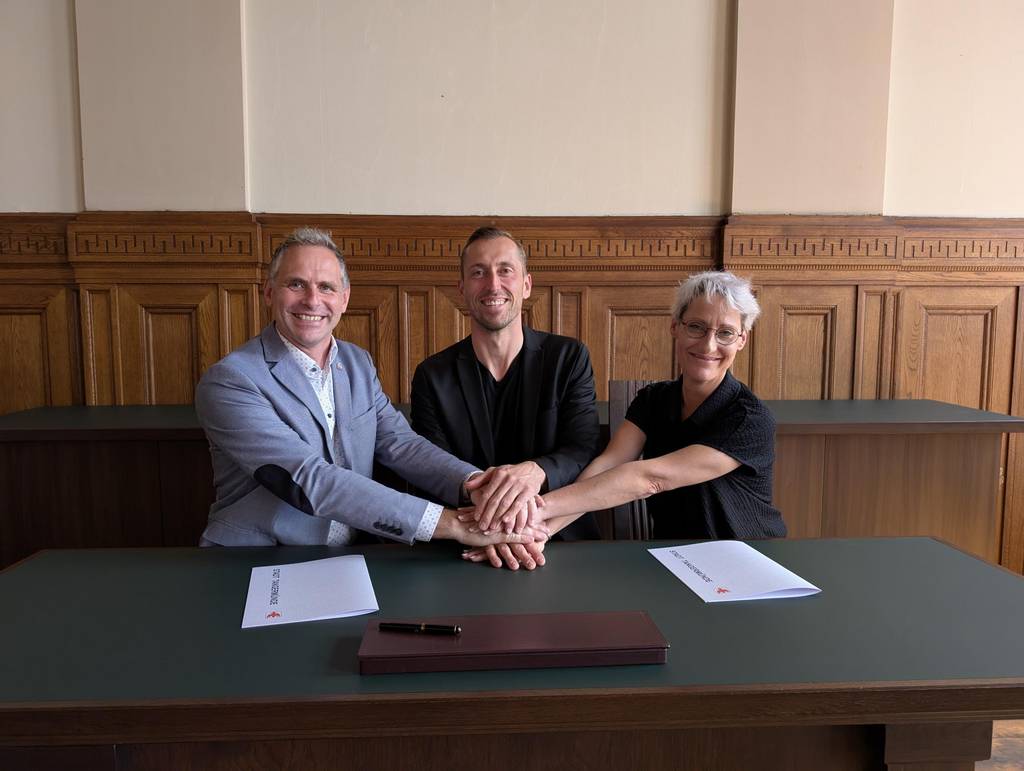 Die Vereinbarung für das Freilufttheater am Hafen von Tangermünde unterzeichneten am Freitag, den 20.06.2025 Steffen Schilm (links) Bürgermeister von Tangermünde und Dorotty Szalma (rechts), Intendantin des Theaters der Altmark (TdA), im Beisein von Stendals Oberbürgermeister Bastian Sieler (Mitte).